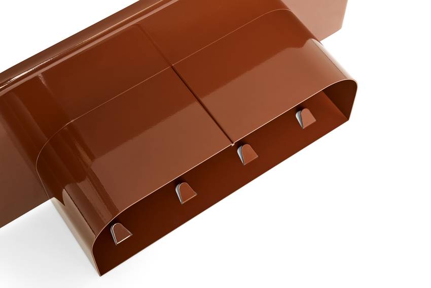 Hylly on valmistettu jauhemaalatusta alumiinista, joka on kevyt, kestävä ja kierrätettävä materiaali. Muoto syntyy teollisessa muovausprosessissa, jossa levy alumiini prässäytyy hyllyksi ja tukirakenteeksi.