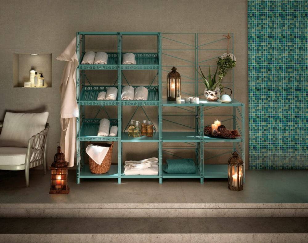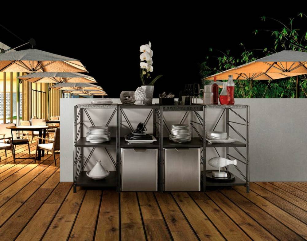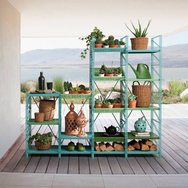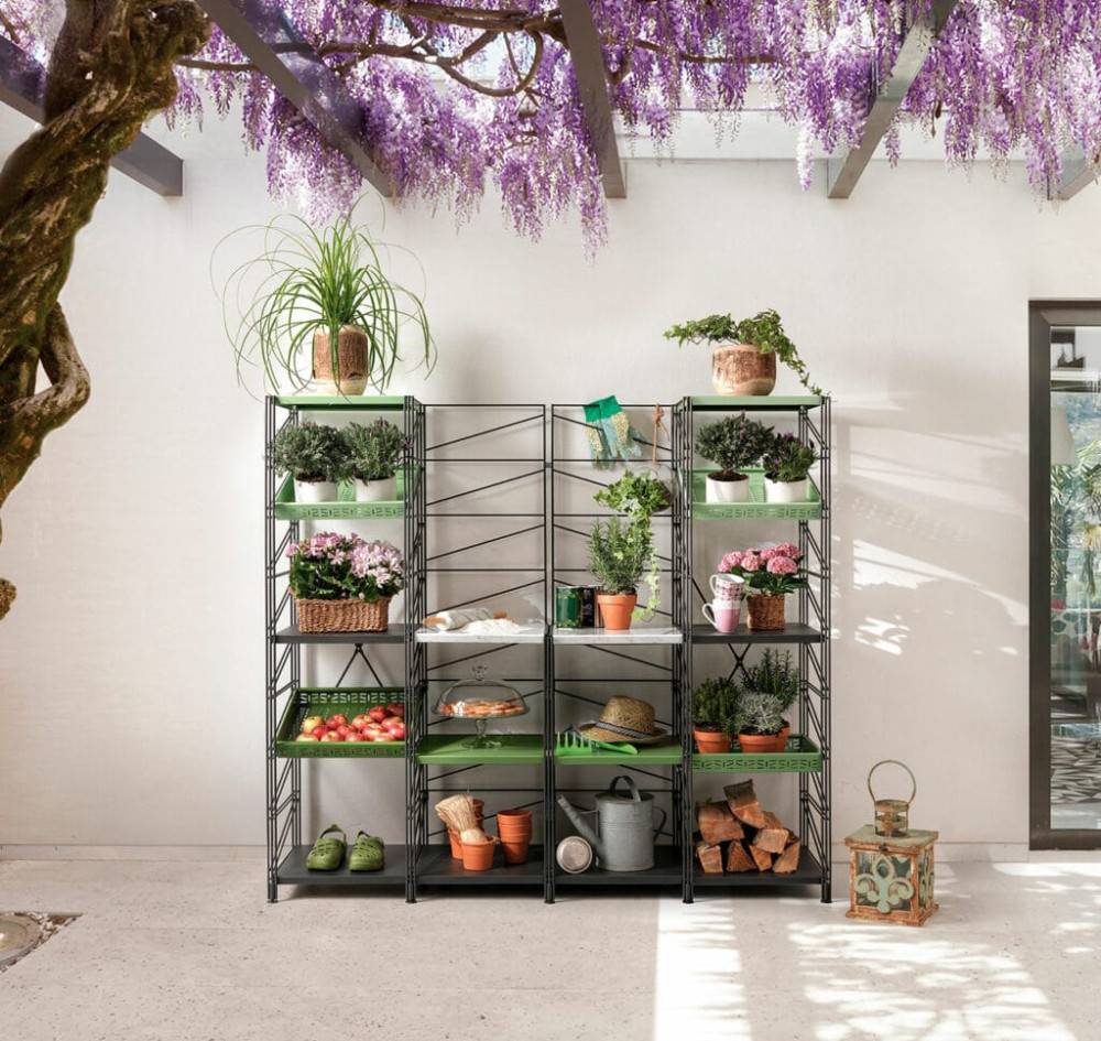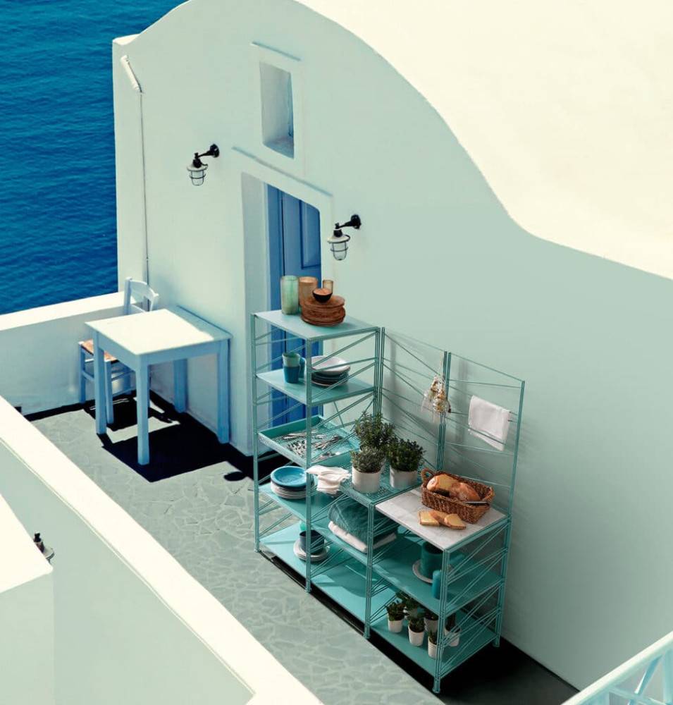 Modulaarinen Socrate Outdoor metallihyllysarja on monipuolinen, joustava ja todella tyylikäs. Hyllyjä voi asentaa suoraan tai vinosti, materiaalina metalli, perforoitu metalli, graniitti tai marmori. Toki hyllykköä voi käyttää myös sisätiloissa. Runkoväreinä antrasiitin harmaa tai välimerellinen turkoosi (RAL 6034). Hyllylevyissä edellisten lisäksi värinä oliivin vihreä (RAL 6025) ja kirkas vihreä (RAL 6021). Serizzo graniitti tai Carrara marmori ovat lisävaihtoehtoina suoriin tasoihin.