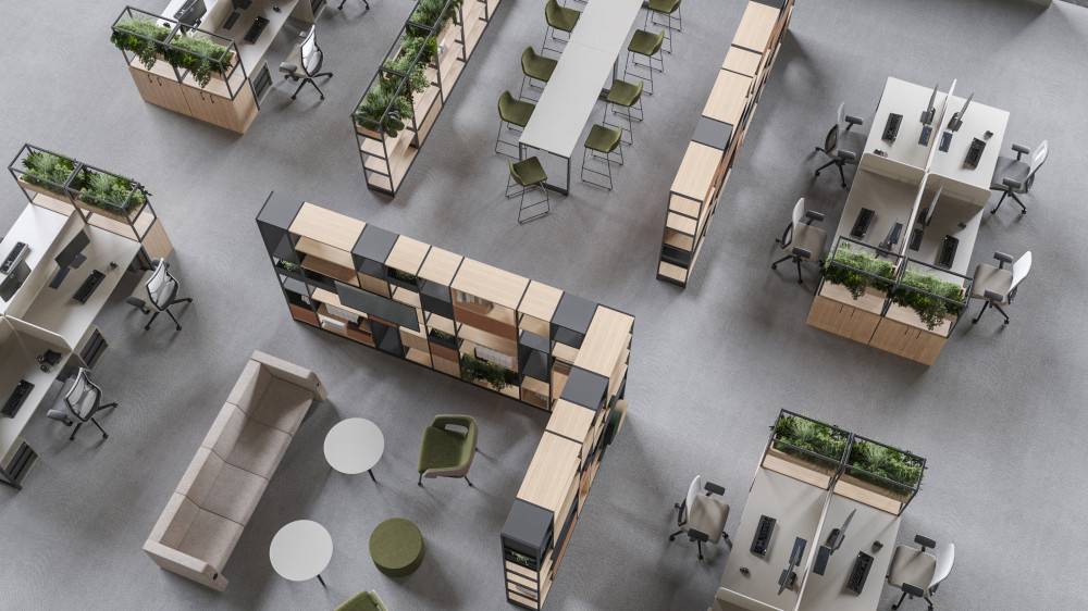 COMBUS mahdollistaa käytännöllisen ja siistin säilytyksen – avo- tai umpipaneelihyllyillä, laatikoilla, laatikkopäädyillä ja lisävarusteilla, kuten kirjatukia ja metallisia kasvilaatikoita. Kasvien integrointi hyllyihin tuo toimistoon vihreyttä ja lisää viihtyisyyttä.