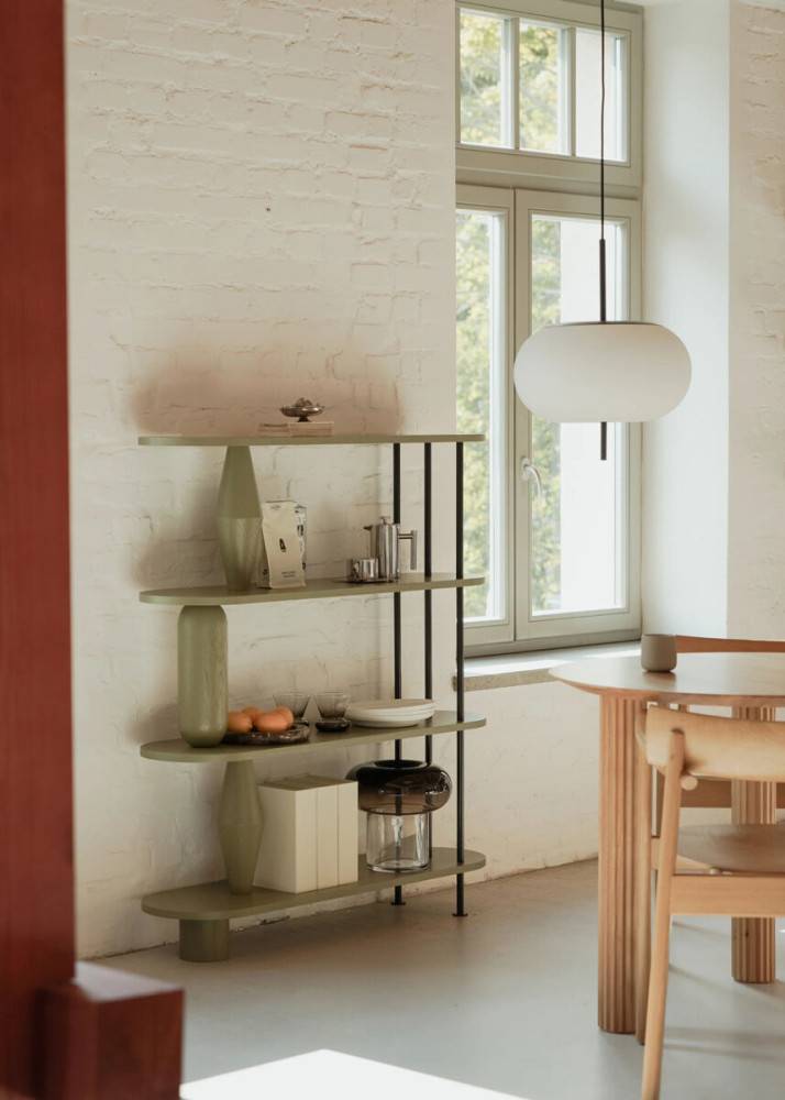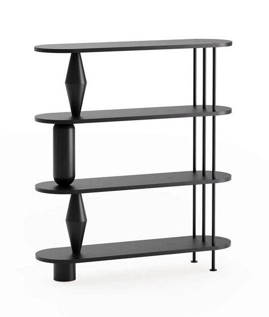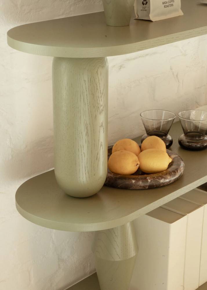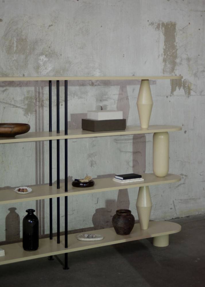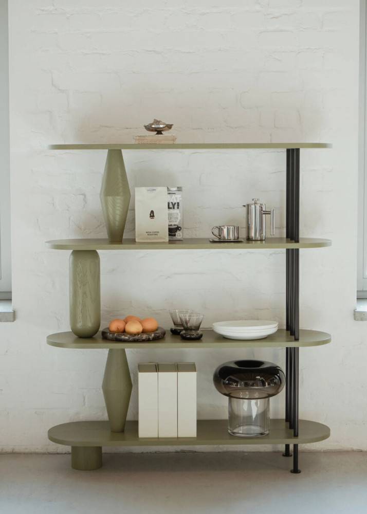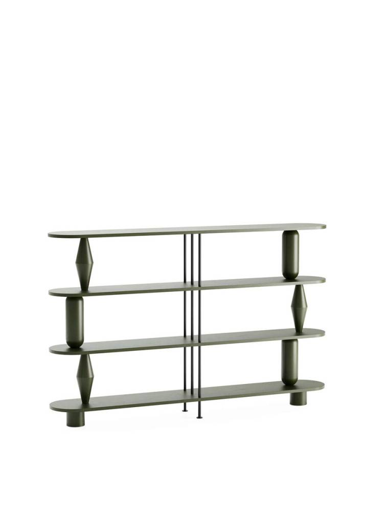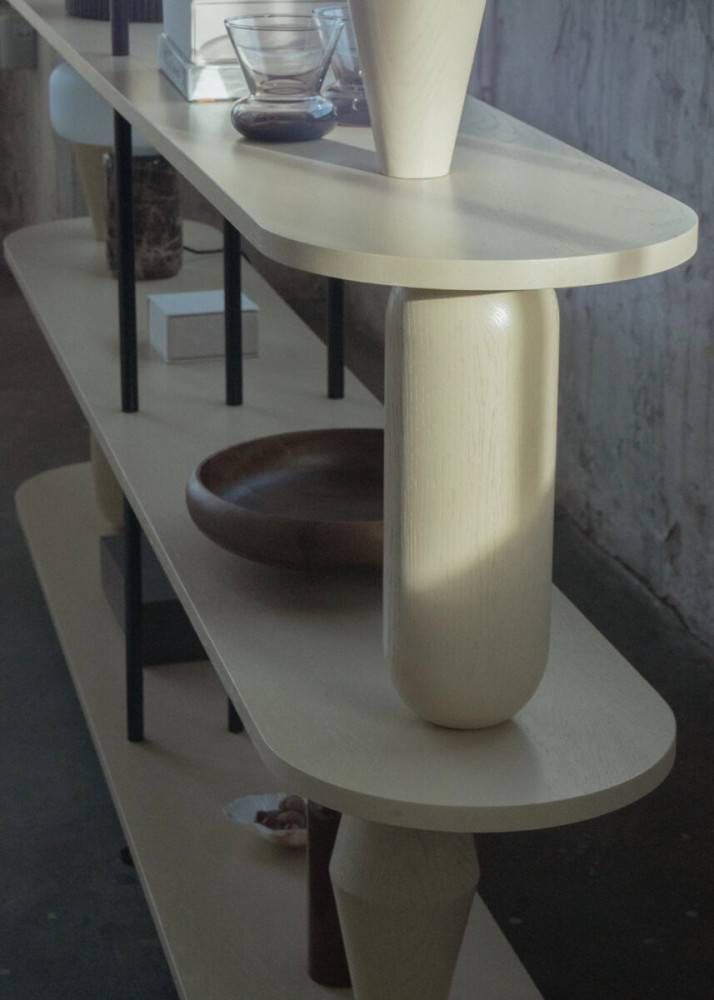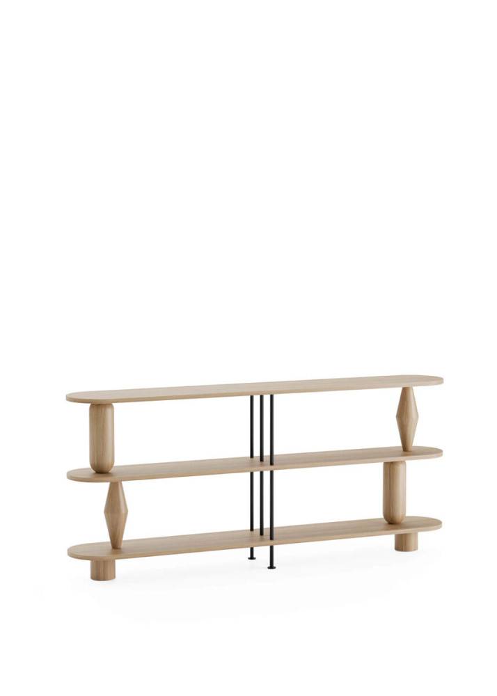 Hylly valmistetaan massiivitammesta (luokka AB). Sorvatut puuelementit muodostavat rakenteen kantavan osan ja antavat kalusteelle tunnistettavan muodon. Rakennetta täydentävät pulverimaalatut terästangot, jotka tuovat kokonaisuuteen keveyttä ja kontrastia. Puuosat voidaan viimeistellä petsillä, öljyvahalla tai lakalla.