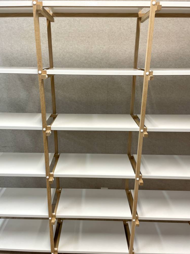Ajaton ja arkkitehtoninen HAY Woody 2.0 -hylly, jossa yhdistyy massiivipuun lämpö ja moderni teräspinta. Avoin rakenne tuo keveyttä tilaan ja tekee hyllystä näyttävän myös tilanjakajana.
