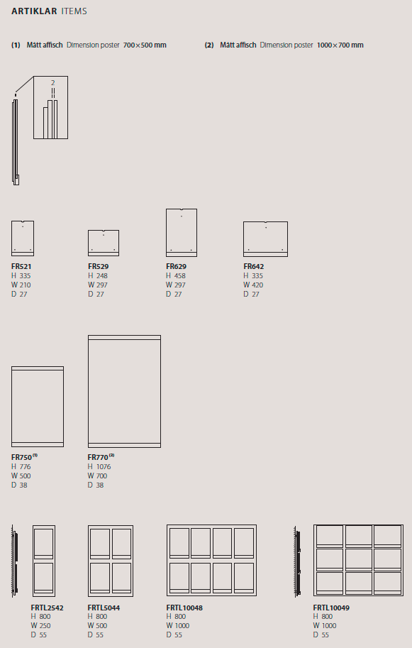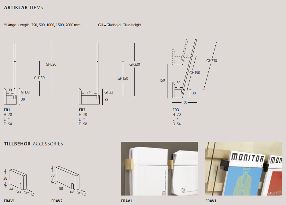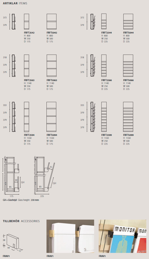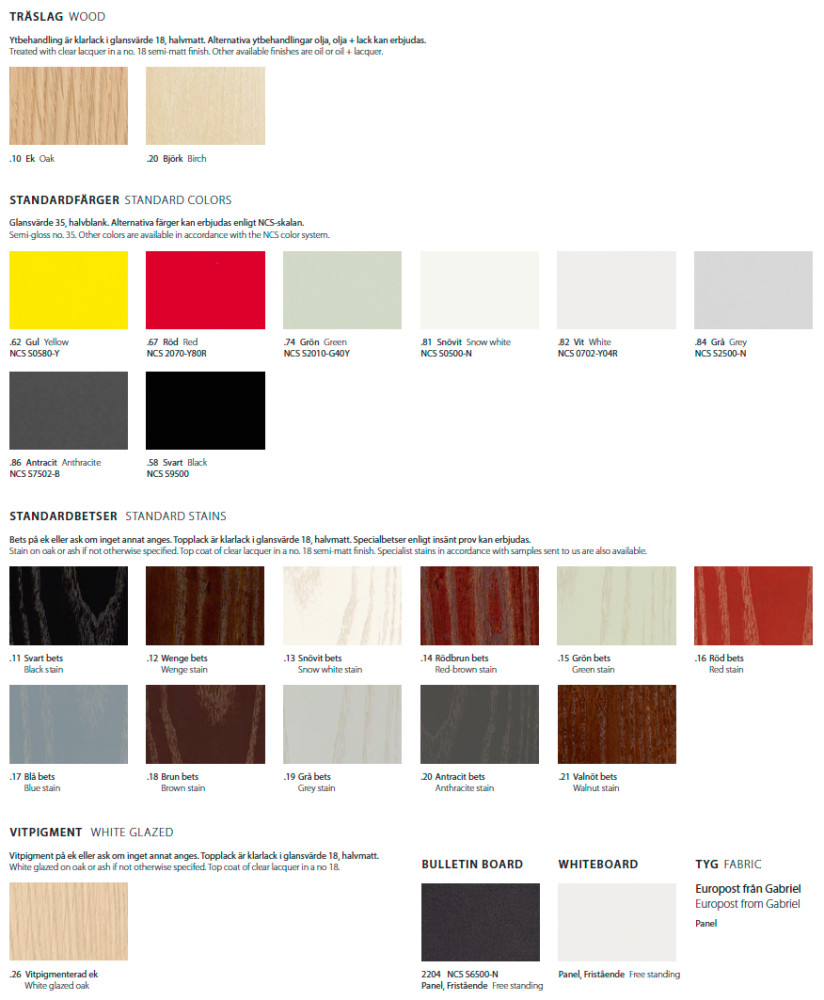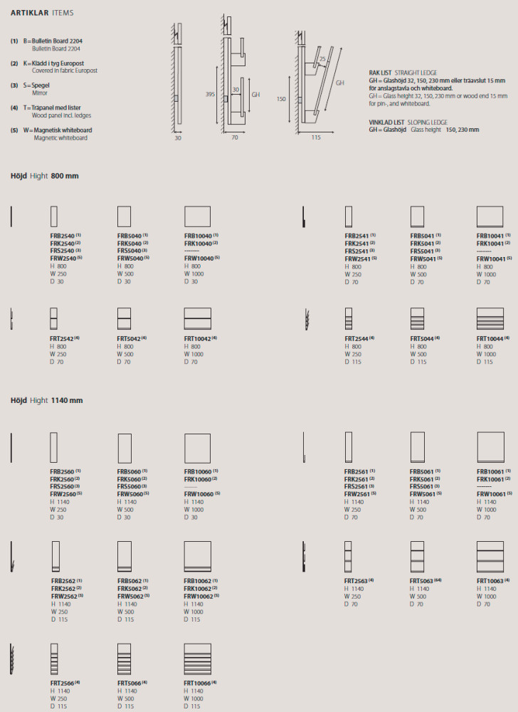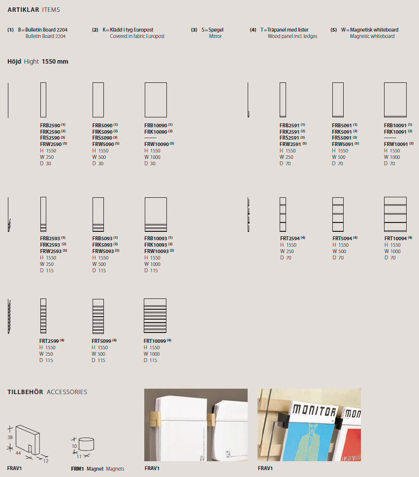 Pituudet vaihtelevat mallista riippuen noin 250–2000 mm. Paneelikorkeuksia on useita vaihtoehtoja. Lisävarusteena on saatavana puinen jakaja lokeroiden muodostamiseen.