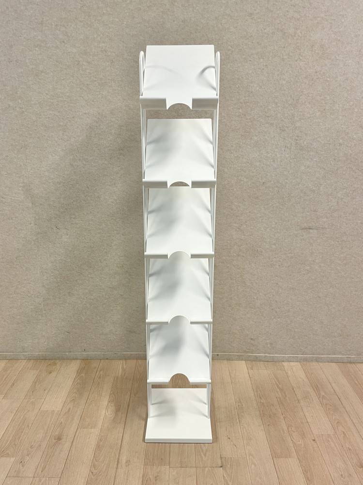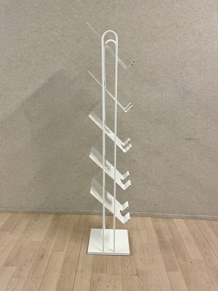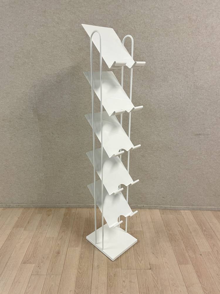 Lattialla seisova, metallinen esiteteline, telineessä 5 tasoa.