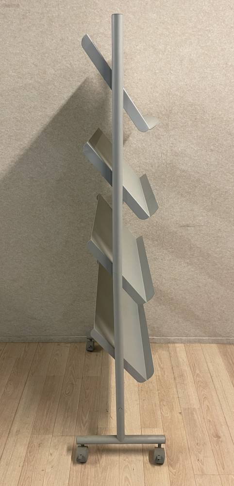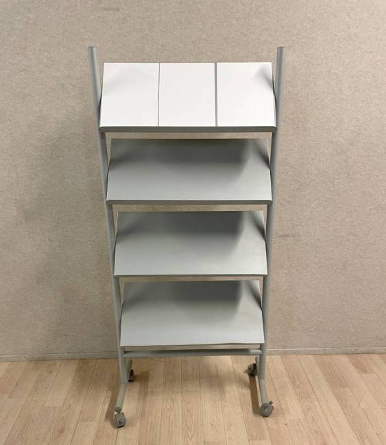 Esiteteline pyörillä, johon hyllylle mahtuu 3x A4