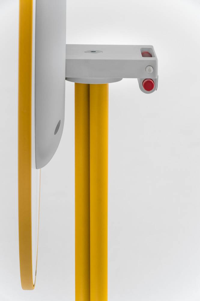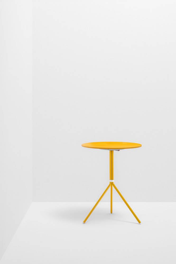 Kolmijalkaisen pöydän pöytälevyn voi kääntää pystyasentoon ja siihen on saatavilla vain pyöreitä pöytälevyjä.