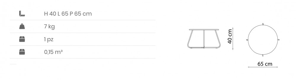 Pöydän korkeus 40 cm. Kansi Ø 65 cm. Paino 7 kg.
