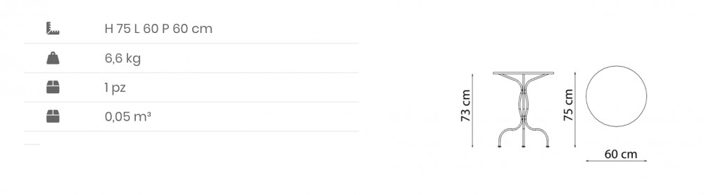 Pöydän korkeus 75 cm. Halkaisija Ø 60 cm. Paino 6,6 kg.