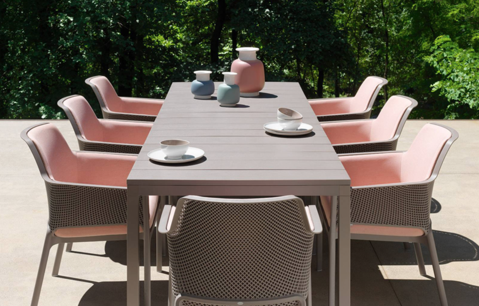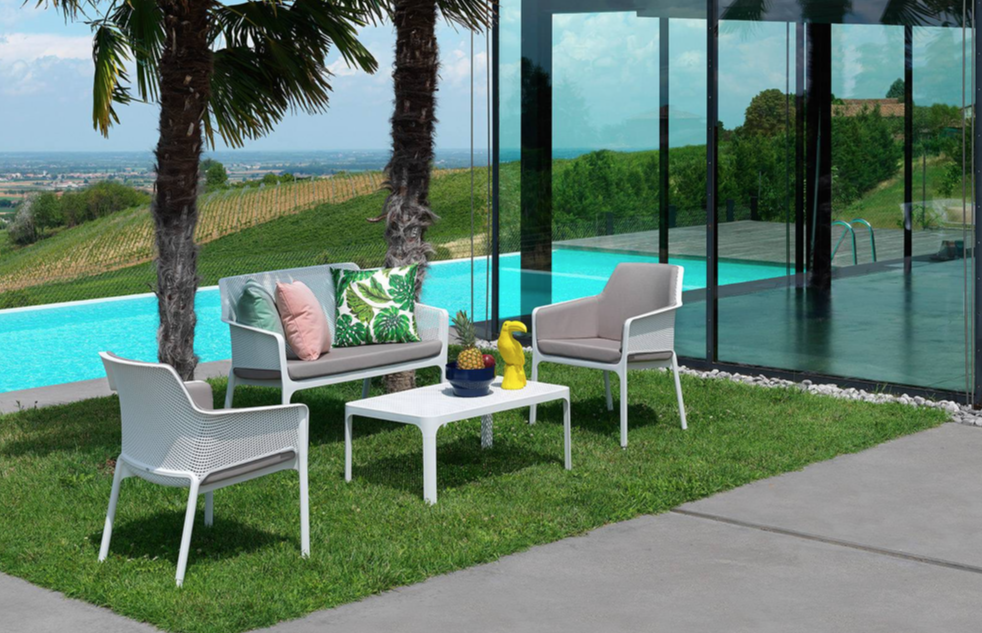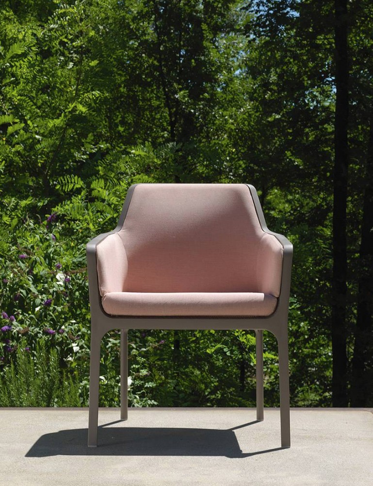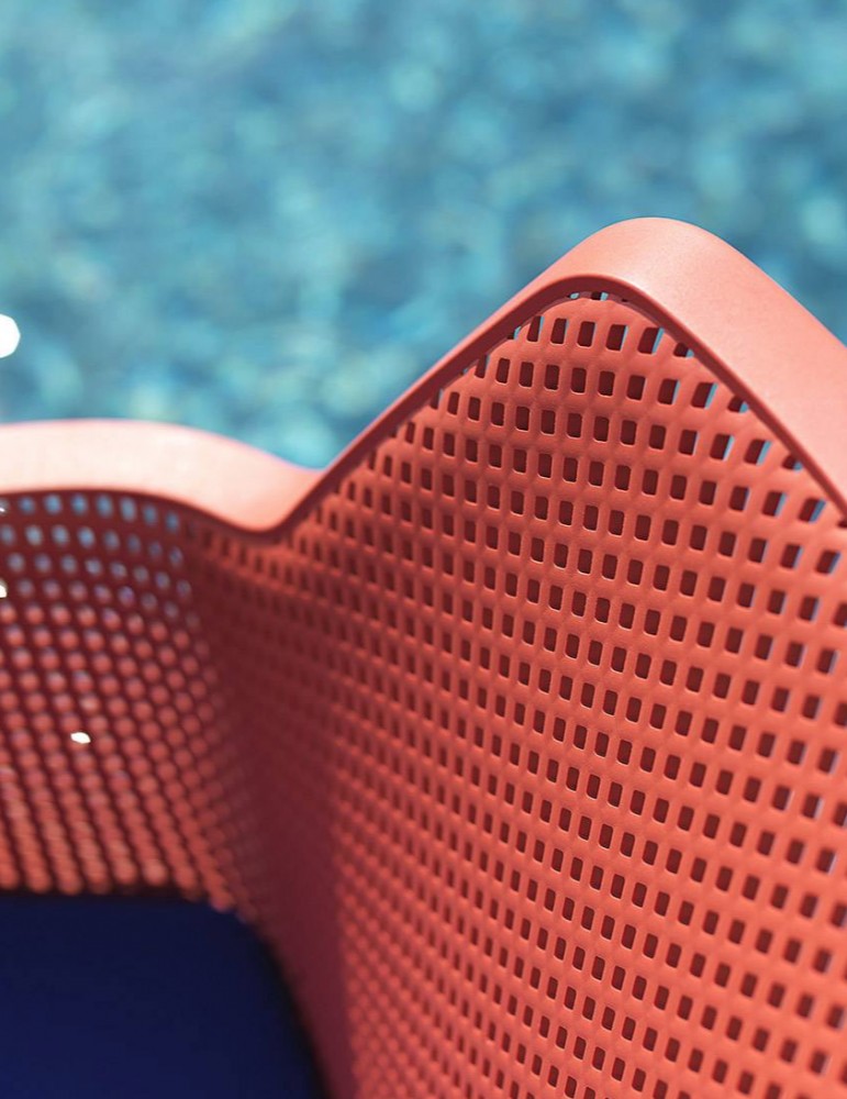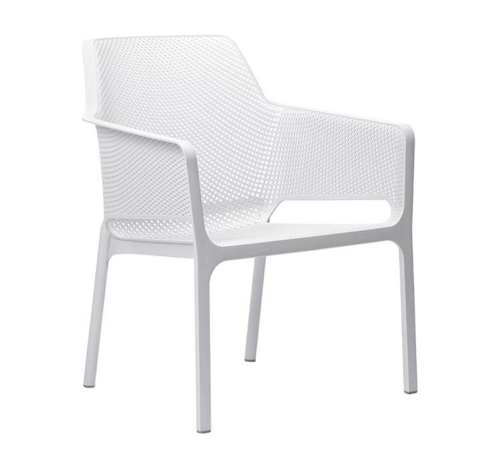 NARDI NET RELAX pinottava tuoli sekä sisä- että ulkokäyttöön. Yksirunkoinen tuoli, jossa selkänoja ja istuin koristelu neliönmuotoisella rei'ityksellä.
