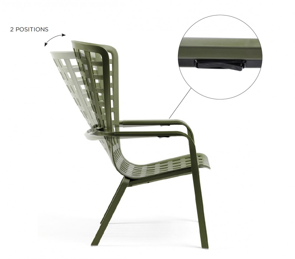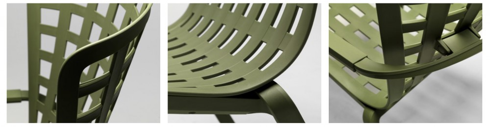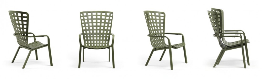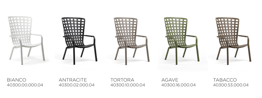 NARDI FOLIO on rentouttava nojatuoli kaarevan muotoilunsa ansiosta. Nojatuolin selkänoja on säädettävissä kahteen eri asentoon. Nojatuoli on valmistettu kierrätettävästä polypropeeni- ja lasikuituseoksesta neliökuvioisella rei'ityksellä.