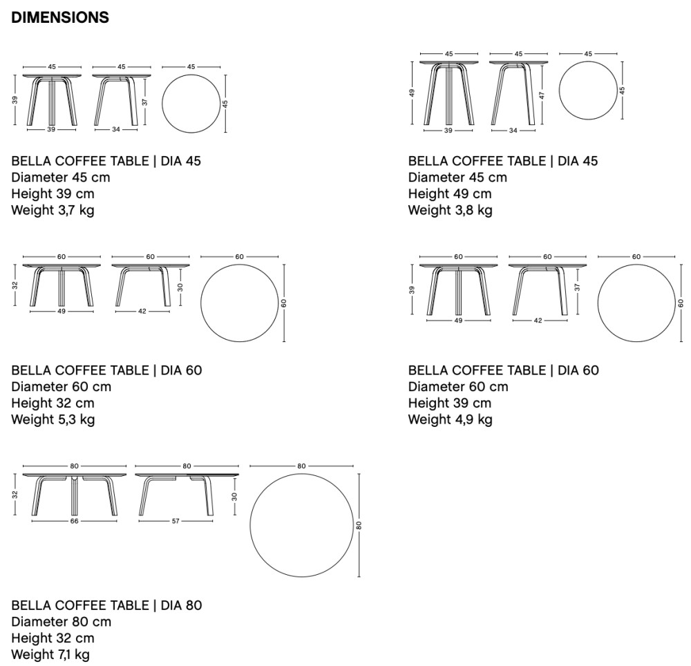 HAY Bella on kompakti ja kevyt sohvapöytä, joka soveltuu monenlaisiin sisustuksiin. Pyöreä, ohut pöytälevy ja selkeälinjainen rakenne tekevät siitä huomaamattoman mutta toimivan osan tilaa. Pöytä soveltuu aulatiloihin, lounge-alueille, toimistoihin sekä koteihin.