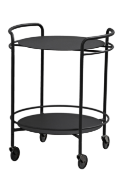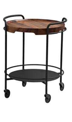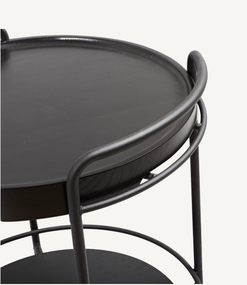 SACKit pyörällinen tarjotinpöytä. Jauhemaalattu matta musta runko luo kauniin kontrastin lakatulle puiselle tarjoilualustalle. Tarjotin on lisävaruste.
