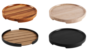 Värivaihtoehtoja akaasia, valkotammi ja musta. Sama tarjotin soveltuu tarjoilupöytään ja rahiin.