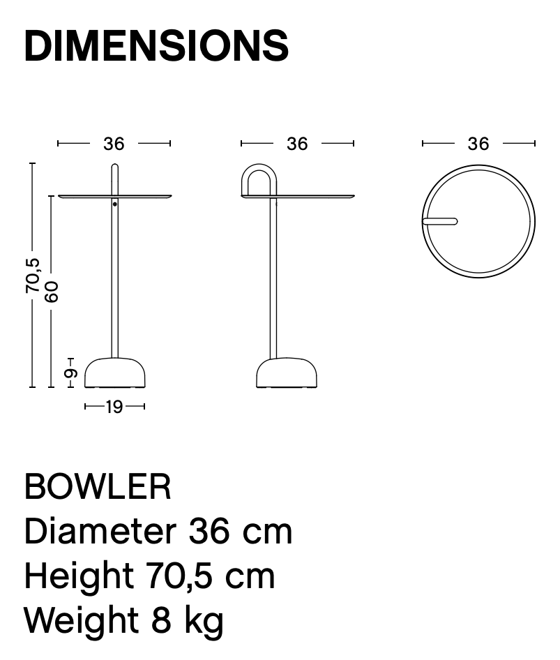 HAY Bowler on kompakti sivupöytä, jossa yhdistyvät selkeä rakenne ja tunnistettava muoto. Pöydän korkea runko ja pieni taso tekevät siitä kevyen ja helposti siirrettävän kalusteen. Bowler soveltuu oleskelutiloihin, auloihin, odotustiloihin ja työympäristöihin lisätasoksi. Kompaktin kokonsa ansiosta se toimii erityisesti pienissä tiloissa tai kalusteiden rinnalla.