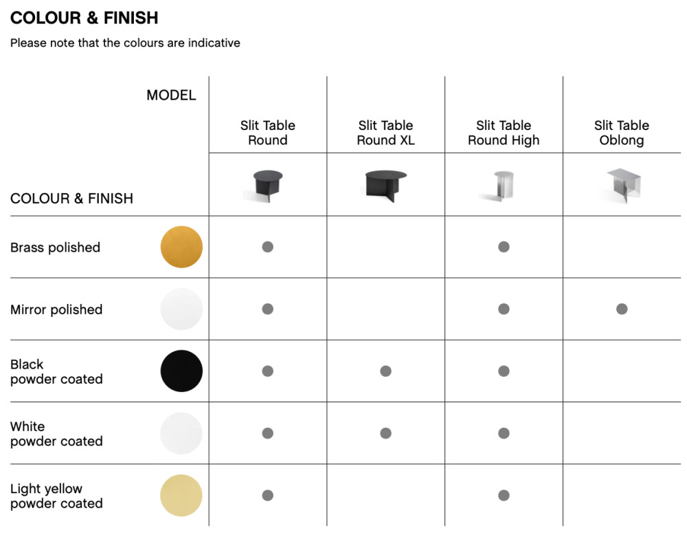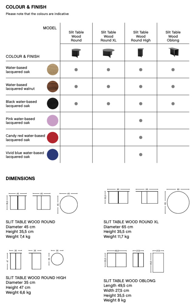 HAY Slit on sohvapöytäsarja, jonka muotoilu perustuu yksinkertaiseen, taitettua pintaa muistuttavaan rakenteeseen. Sarja sisältää sekä metallisia että puupintaisia pöytiä, joissa yhdistyvät kevyt ilme ja selkeä geometrinen muoto. Slit-pöydät soveltuvat oleskelutiloihin, auloihin, odotustiloihin ja toimistoihin. Kompaktin rakenteen ansiosta pöytiä voidaan käyttää yksittäin tai yhdistellä ryhmiksi eri tilaratkaisuihin.