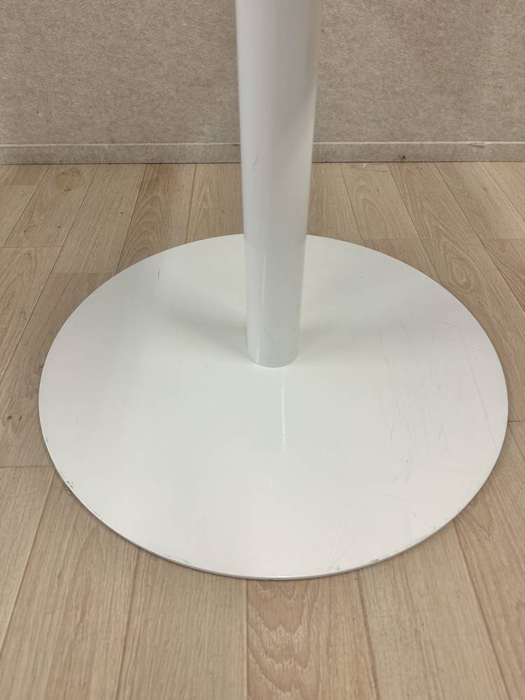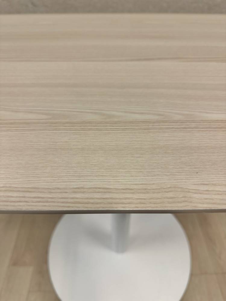 Selkeälinjainen pöytä, jonka viistetty saarnilaminaattikansi yhdistyy raikkaaseen valkoiseen laippajalkaan. Yhdistelmä luo kevyen ja modernin vaikutelman, joka sopii monenlaisiin ympäristöihin. Materiaalit kestävät hyvin päivittäistä käyttöä ja pöytä on helppo pitää siistinä.
