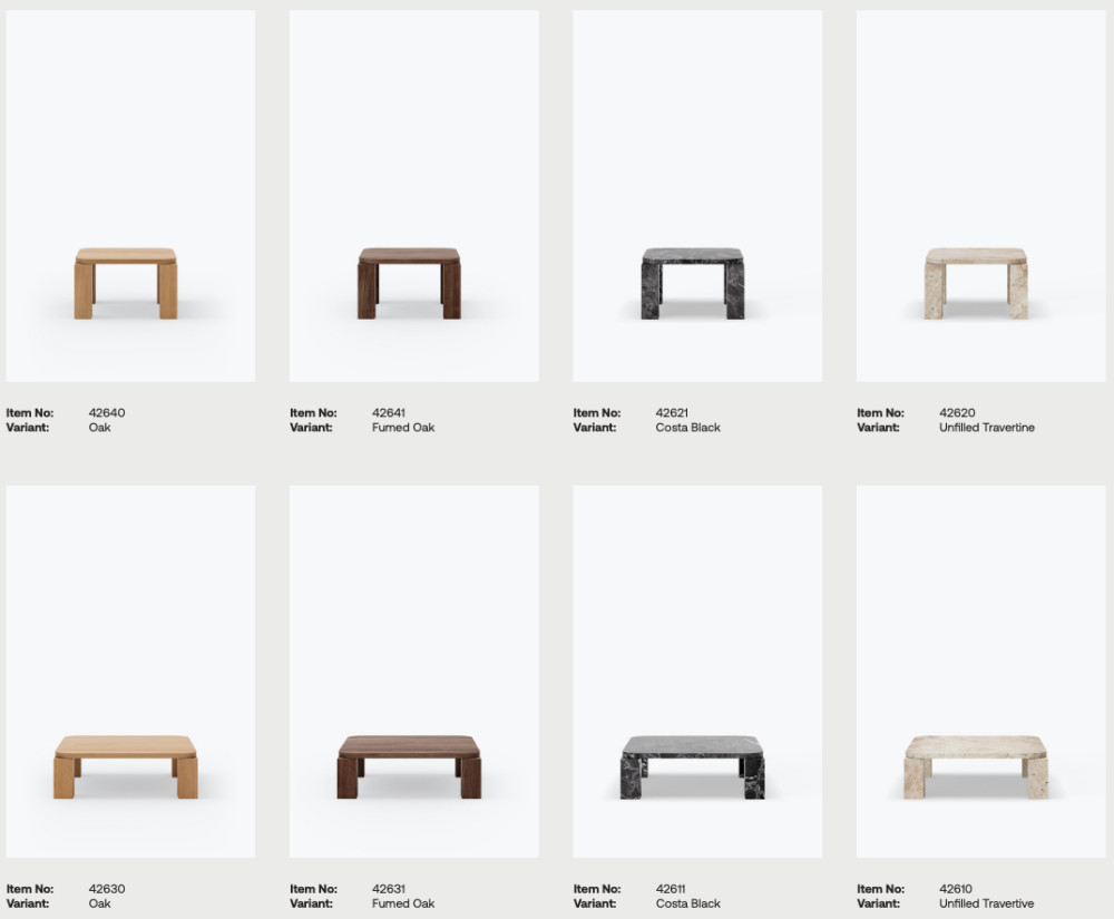 Atlas-sohvapöydästä on saatavana kaksi kokoa, 60 × 60 cm ja 82 × 82 cm, sekä puu- ja marmoriversiot eri viimeistelyillä. Sama sarja sisältää myös ruokapöytiä, sivupöytiä ja penkkejä, jotka jakavat saman selkeän muotokielen ja mittasuhteiden harmonian