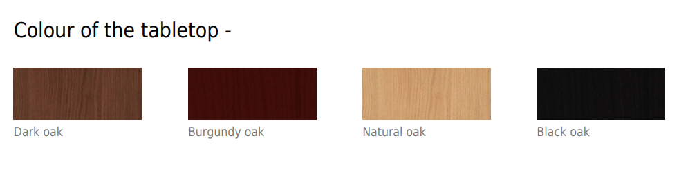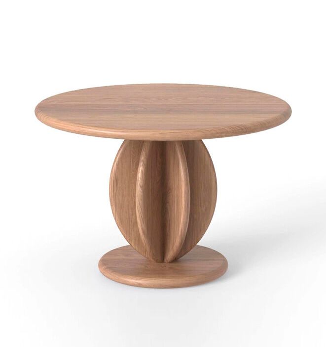 Pöytä valmistetaan massiivipuusta, vaihtoehtoina tammi tai saarni. Pinta on viimeistelty lakalla, joka suojaa puupintaa ja korostaa materiaalin luonnollista rakennetta. Jalustan veistetty rakenne muodostaa pöydälle tukevan mutta visuaalisesti kevyen perustan.