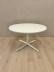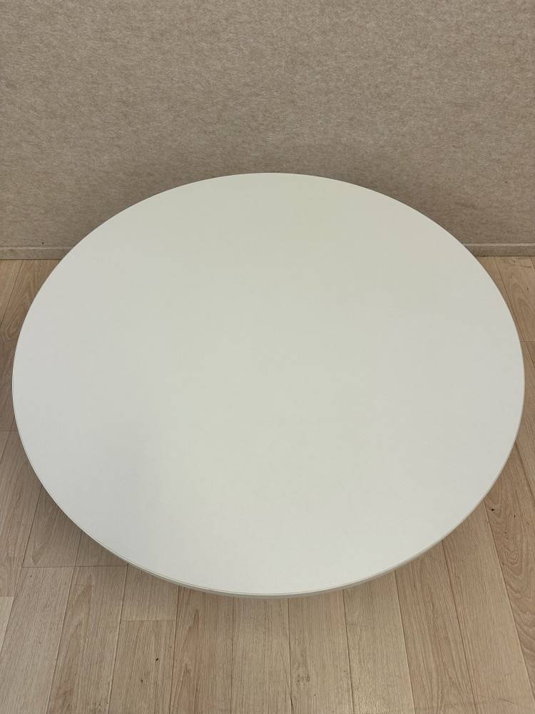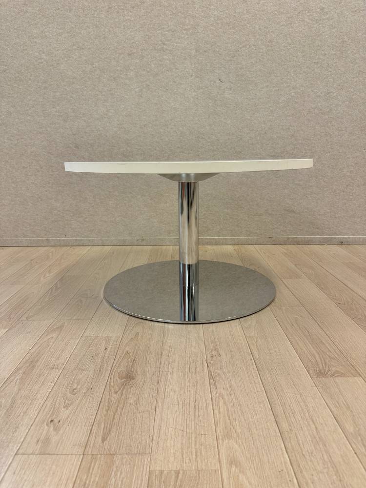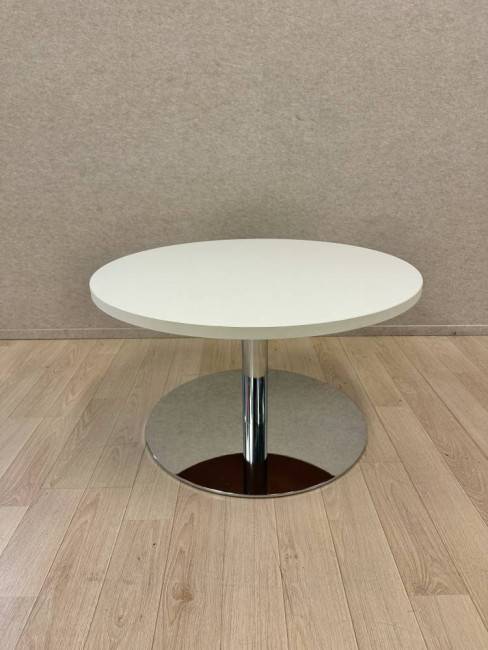 Ajaton pyöreä sohvapöytä, jossa on valkoinen kansi ja kromattu laippajalka. Muotoilu on selkeä ja jalka antaa pöydälle tukevan rakenteen, joka kestää hyvin päivittäistä käyttöä. Kompakti koko tekee pöydästä käytännöllisen valinnan auloihin, odotustiloihin ja toimistoympäristöihin.