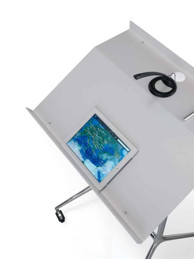 Speech Lectern puhujanpönttö pyörillä on kätevä moneen eri tilaisuuteen. Pulverimaalattu alumiininen pönttöosa, joko mustana tai valkoisena, jalusta kiillotettua alumiinia. Lukittavat pyörät.