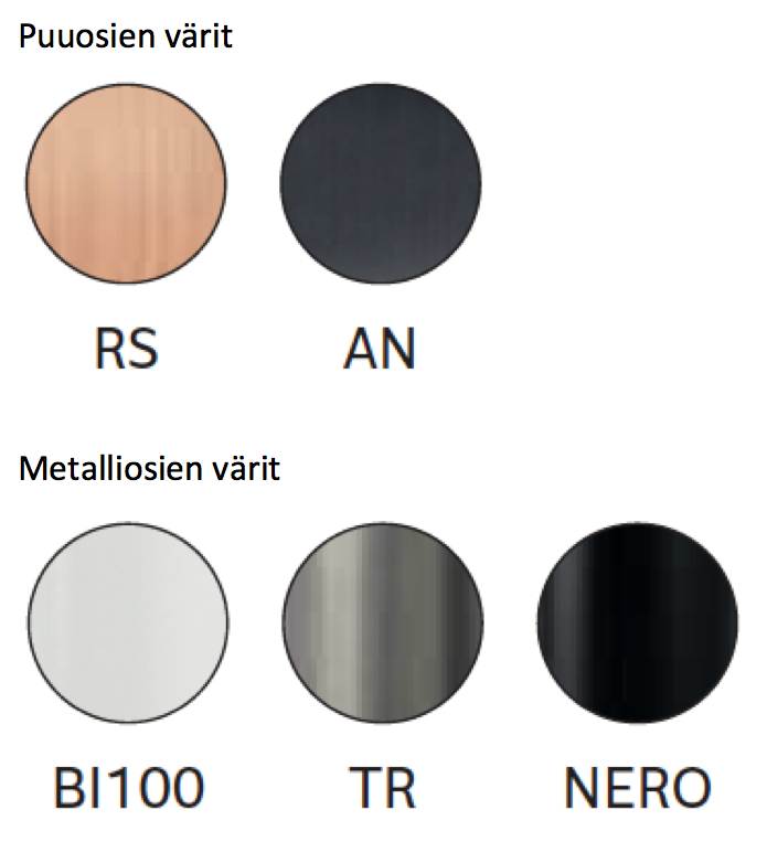 Tuolien puuosat ovat tammea ja metalliosat pulverimaalatua terästä.