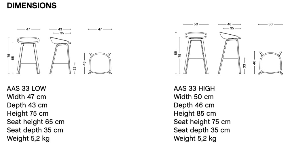 Istuinkuppi on ruiskuvalettua polypropeenia, joka sisältää 100 % kierrätettyä materiaalia. Pinta on matta ja kevyesti teksturoitu. AAS 32 -mallissa istuin on saatavana ilman verhoilua, etuverhoiltuna tai erillisellä istuinpehmusteella. AAS 33 on täysin verhoiltu.