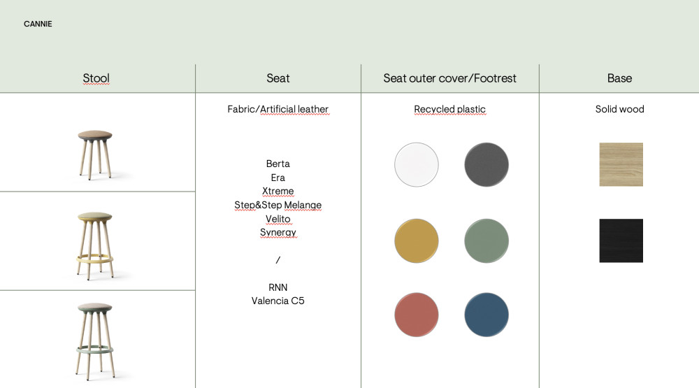 CANNIE jakkarassa yhdistyvät laadukkaat materiaalit ja simppeli, mutta leikkisä muotokieli. Jakkaran saa sopimaan tilaan kuin tilaan, sillä värit voi valita muuhun sisustukseen sopivaksi. Cannie on ihanteellinen valinta esim. aula- tai taukotilaan.