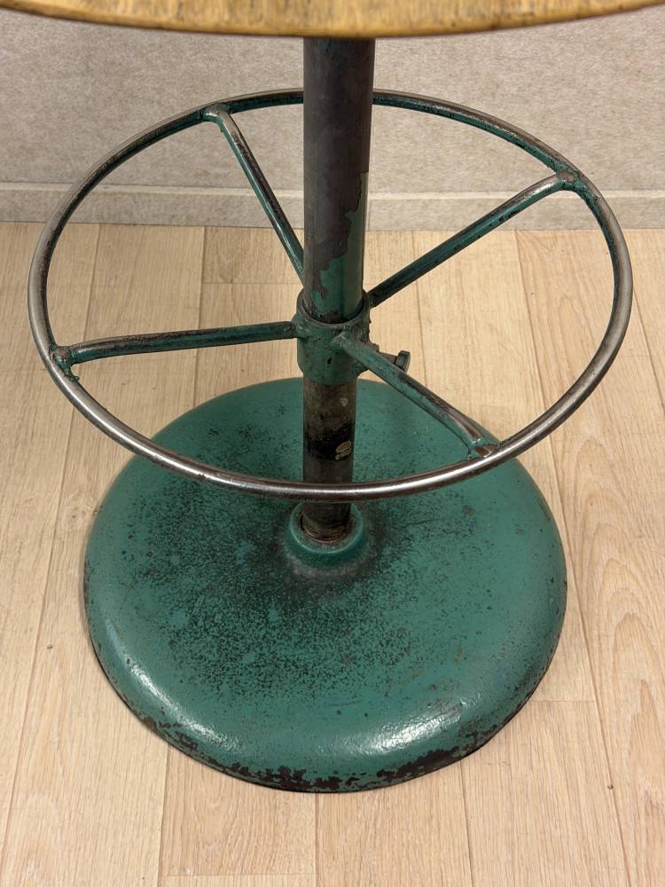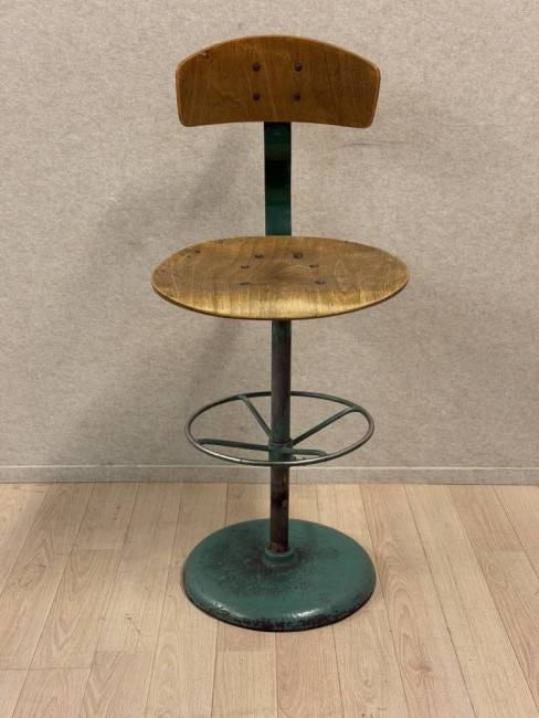 Tämä vintage-tyylinen baarituoli edustaa teollishenkistä ja rouheaa muotoilua. Tuolissa on puinen istuin ja selkänoja sekä metallinen runko, jossa näkyy ajan myötä syntynyt patina. Raskas pyöreä jalusta ja metallinen jalkatuki tekevät rakenteesta vakaan.