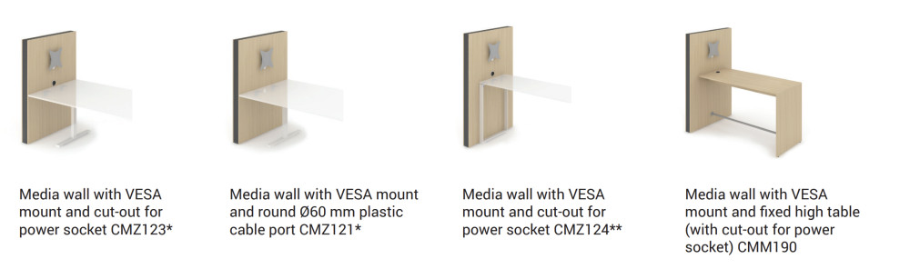 MEDIA seinässä on VESA standardin mukainen pidike näytölle ja valittavissa erilaisia vaihtoehtoja johtojen järjestelylle. Värivaihtoehtoja on useita.