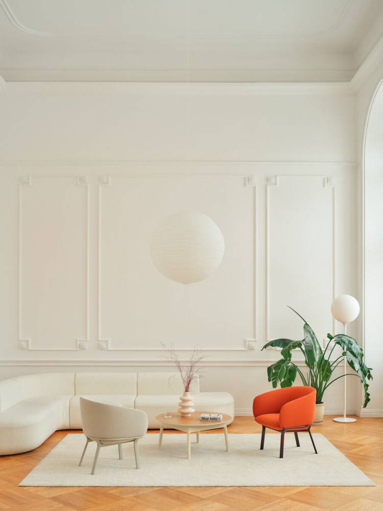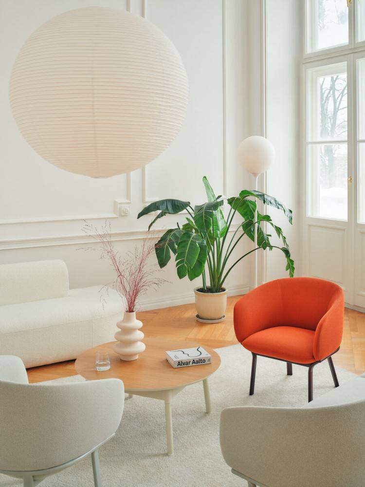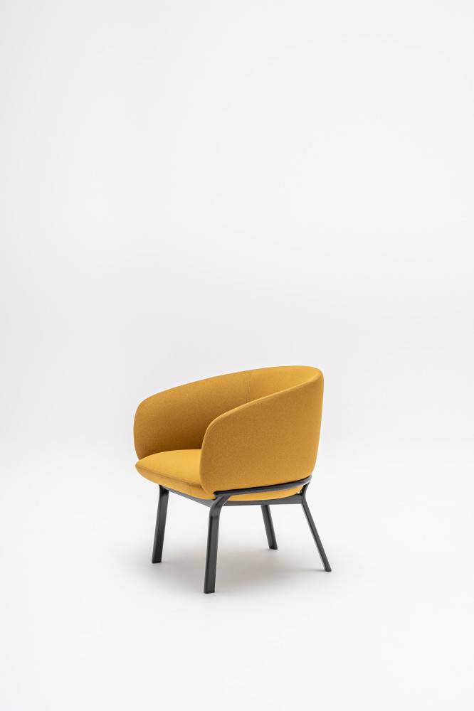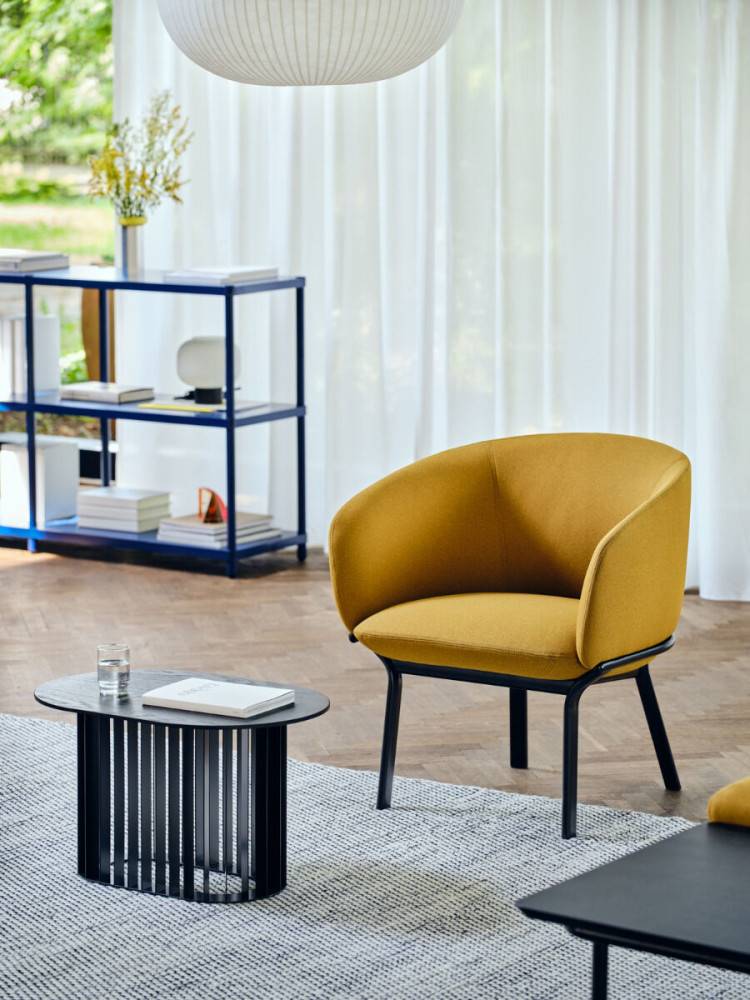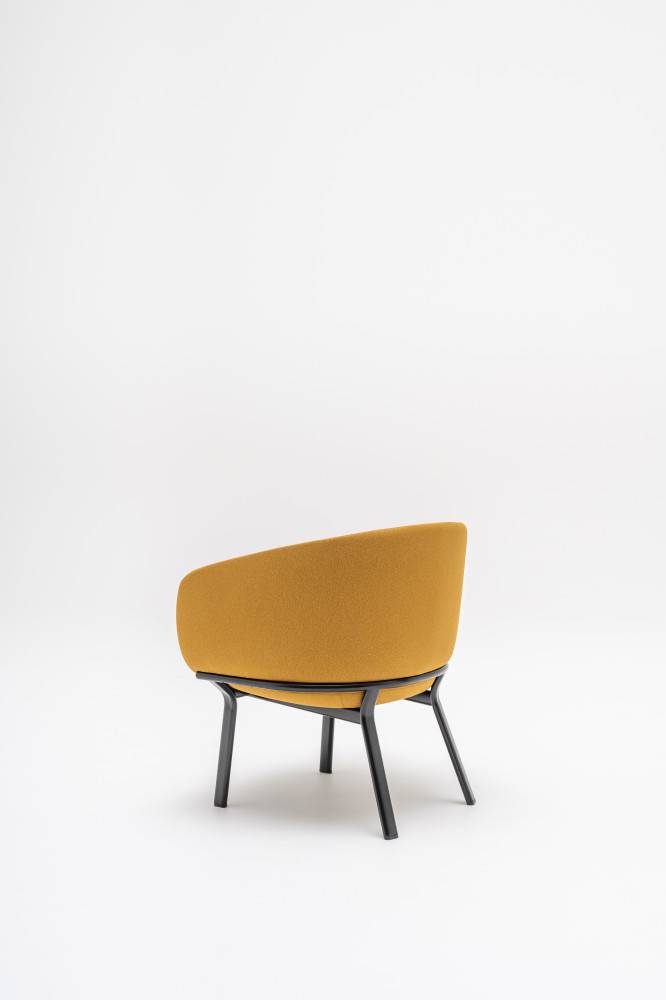 Muotoiltu selkänoja tukee alaselkää ja hartioita, ja käsinojat seuraavat ylävartalon linjaa tarjoten luonnollisen tuen käsivarsille. Korkeat jalat helpottavat istuutumista ja ylös nousemista, ja jämäkämpi, yhdestä muotista valettu vaahto estää istujaa uppoamasta liian syvälle. Kevyt metallirunko tekee kalusteista helposti siirrettäviä.