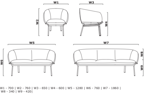 • Sohva 3-istuttava: 1860 × 650 mm, korkeus 760 mm, istuinkorkeus 430 mm