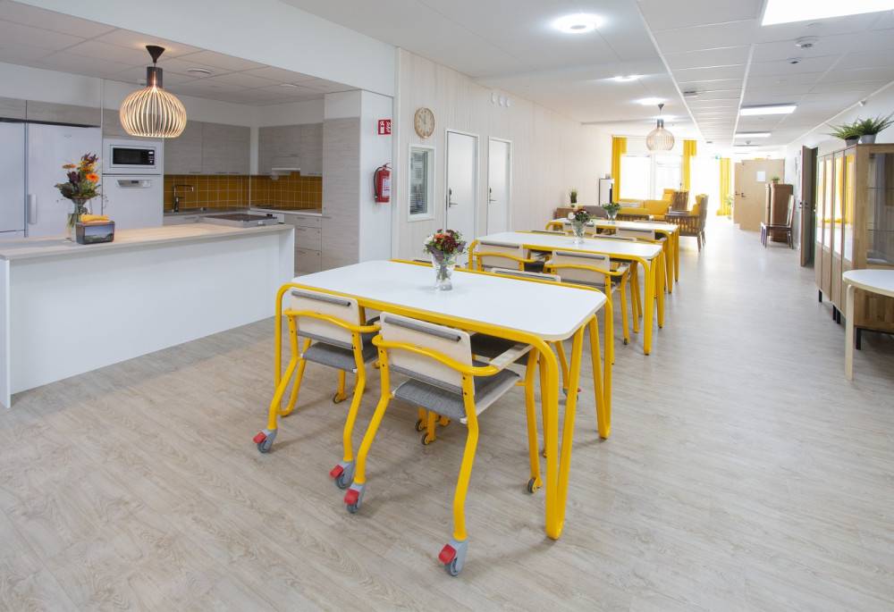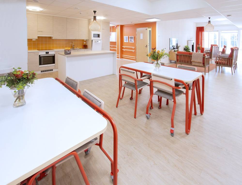 Esteetön rakenne ja riittävä vapaa tila pöytäkannen alla mahdollistavat pöydän käytön myös apuvälineiden kanssa. Helposti puhdistettava kansimateriaali ja kestävä runkorakenne tekevät pöydästä sopivan tiloihin, joissa kalusteet ovat jatkuvassa käytössä ja hygienia on tärkeä osa arkea.