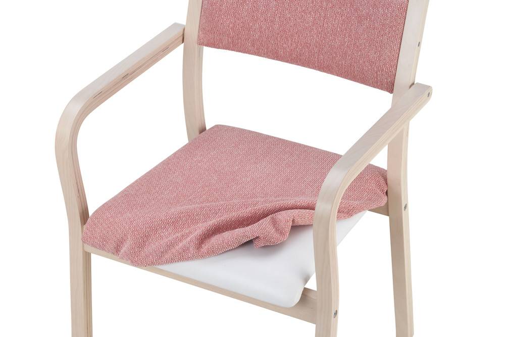 Istuin ja selkänoja ovat lakattua koivuviilua. Puuosat ovat saatavissa myös petsattuina. Pinnan sileys helpottaa puhdistusta ja tukee hygienian ylläpitoa hoivaympäristöissä.