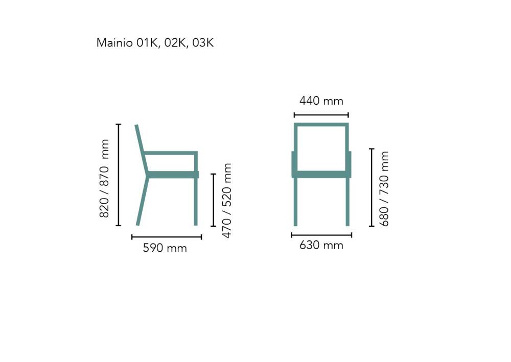 Tuoleissa on maalattu metallirunko, joka kestää kovaa käyttöä ja jatkuvaa kuormitusta. Rakenne soveltuu hoivaympäristöihin, joissa kalusteiden tulee olla pitkäikäisiä ja turvallisia. Kalusteet valmistetaan Suomessa.