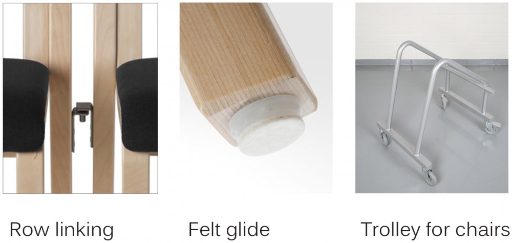 Lisävarusteena on saatavana rivikytkentähela, jonka ansiosta tuolit on nopea liittää toisiinsa ja irrottaa toisistaan. (Rivikytkentähela ei vaikuta pinottavuuteen.)