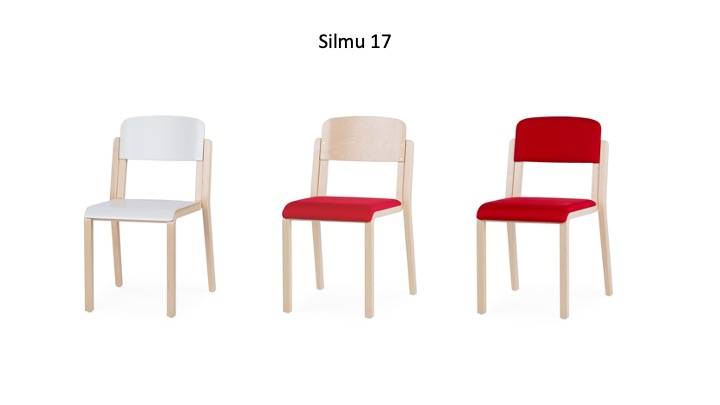 Silmu 16/17 tuoli on kevyt ja helposti pinottava kaluste. Rungon materiaali lakattu koivuvaneria, jaloissa huopanastat. Selkänojan muoto valittavissa: joko neliö (Silmu 16) tai pyöristetty (Silmu 17), katso lisäkuvat.