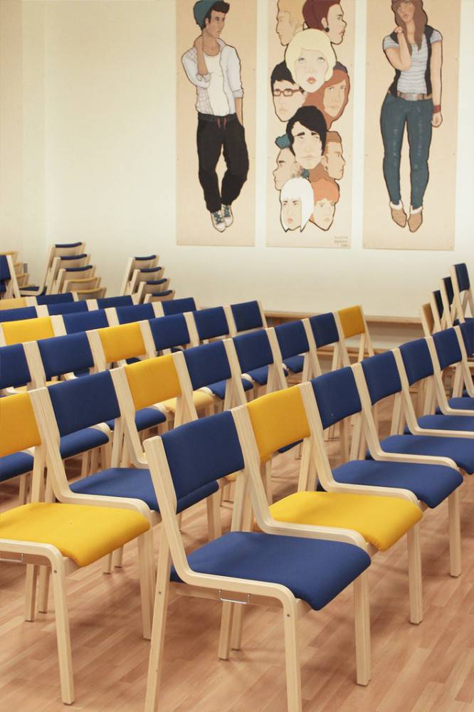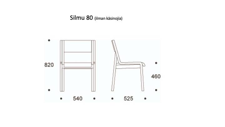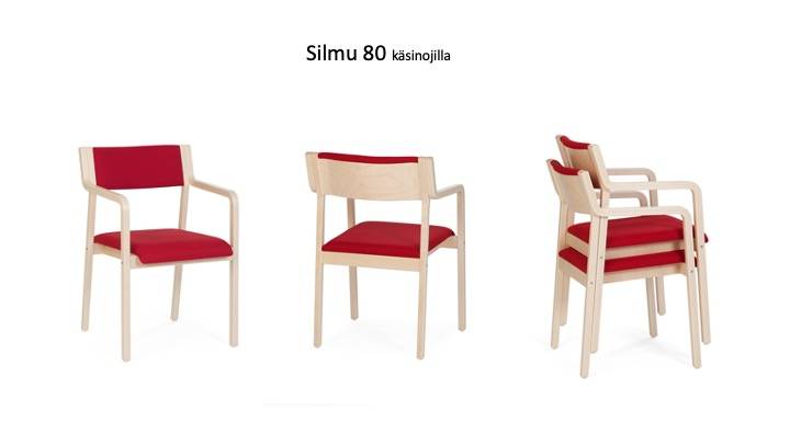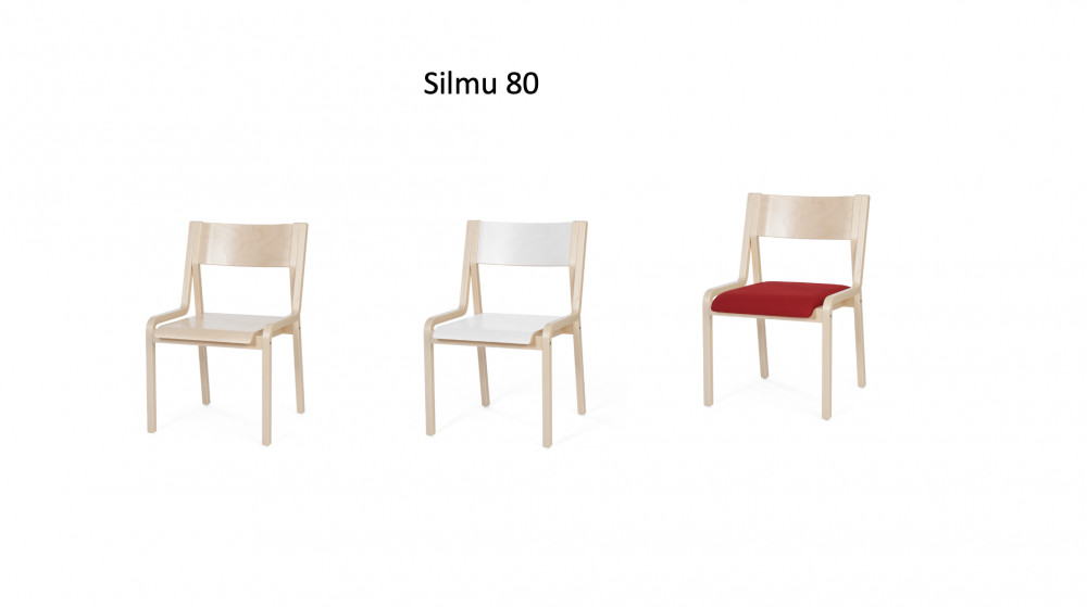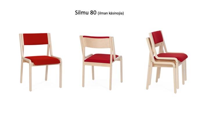 SILMU 80 tuoli on mm. juhlasaliin tai neuvottelutiloihin soveltuva pinottava tuoli. Tuolin saa joko käsinojilla tai ilman. Tuolin materiaalina lakattu koivuvaneri, jaloissa huopatassut.