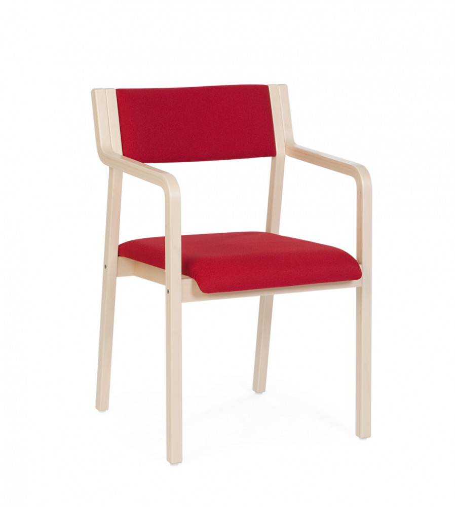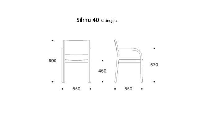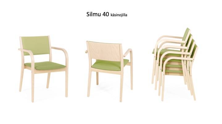 SILMU 40 tuoli on mukavan tuntuinen, pinottava käsinojallinen tuoli esim. neuvottelu- tai loungetiloihin. Materiaalina lakattu koivuvaneri, jaloissa huopatassut.