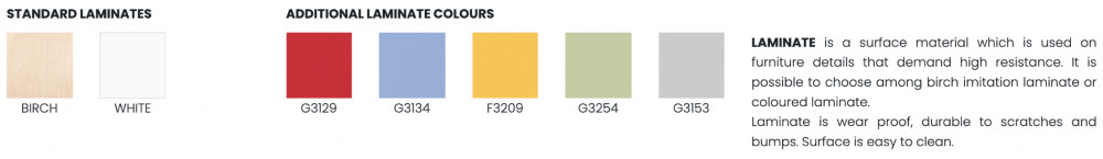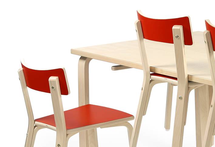Silmu pöytä on vahva ja kestävä laminaattipintainen pöytä, jonka jalat ovat 60x30 mm taivutettua koivuvaneria. Laminaatti on hyvin kulutusta kestävää, kestää naarmuja ja kolhuja. Pinta on helppo puhdistaa.
