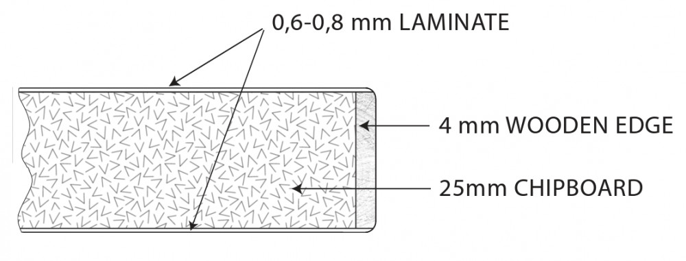 Pöytälevy: paksuus 25 mm, reunat 4 mm paksua masiivikoivua, reunat ja kulmat pyöristetty 2 mm