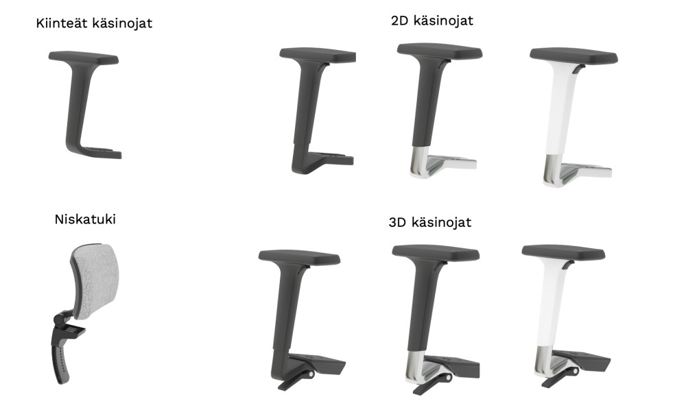 Esimerkkihinta laskettu mustalla rungolla ja mustalla muoviristikolla, hintaryhmän 1 istuinverhoilulla ja hintaryhmän1 verkkoselkänojalla, mustilla 2D käsinojilla, ilman niskatukea, istuimen syvyyssäädöllä, tavallisilla pyörillä.