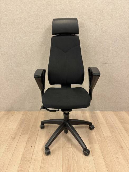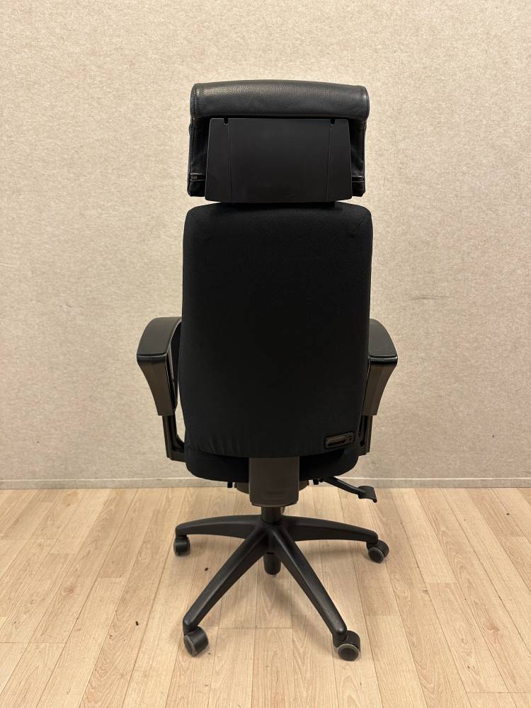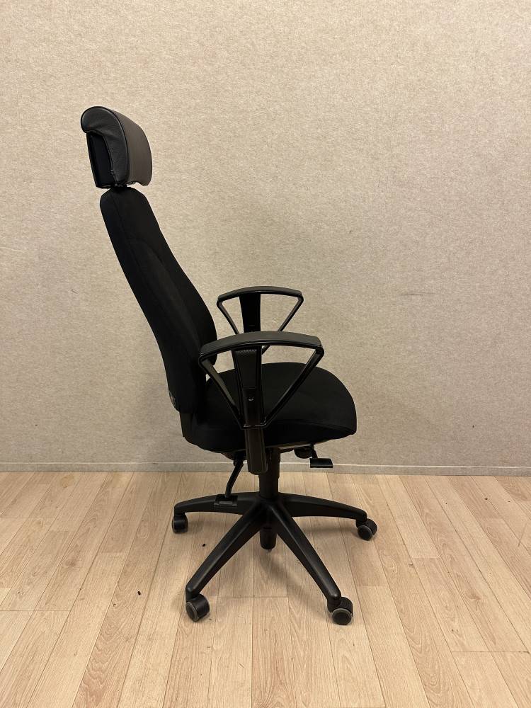 Tuolissa on musta kangasverhoilu ja nahkainen niskatuki, jotka yhdistävät kestävyyden ja mukavuuden. Laadukas rakenne ja monipuoliset säätömahdollisuudet tekevät siitä erinomaisen valinnan toimistoihin, joissa ergonomia ja pitkäikäisyys ovat tärkeitä.