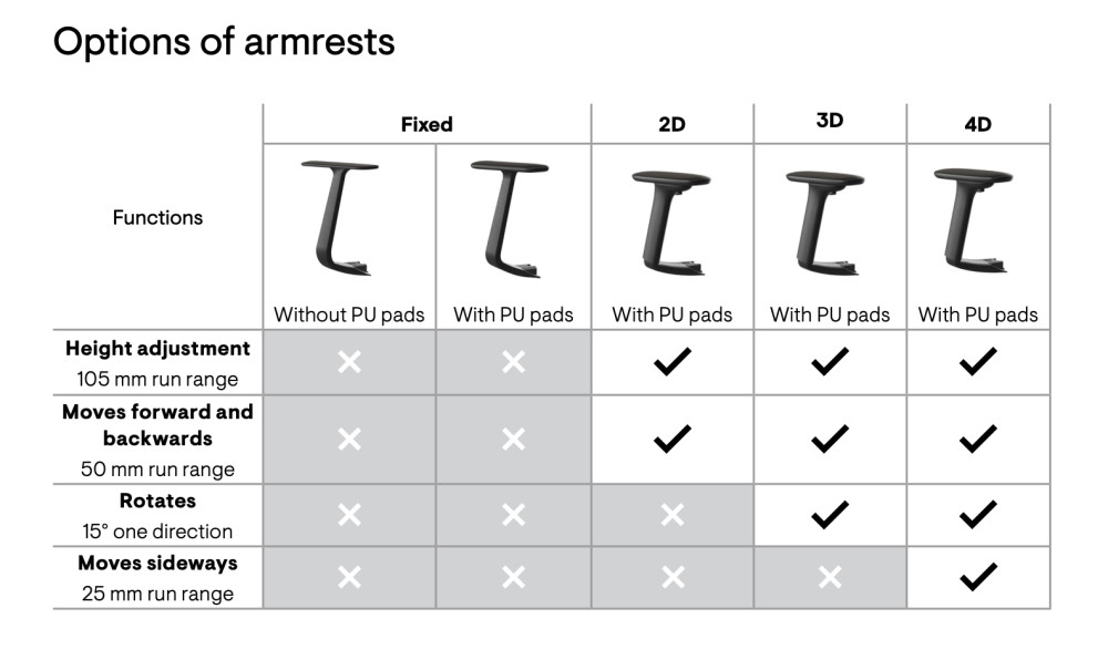 - 4D käsinojat, pehmeä päällinen, korkeus-, leveys- ja syvyyssäätö sekä käsinojan kierto