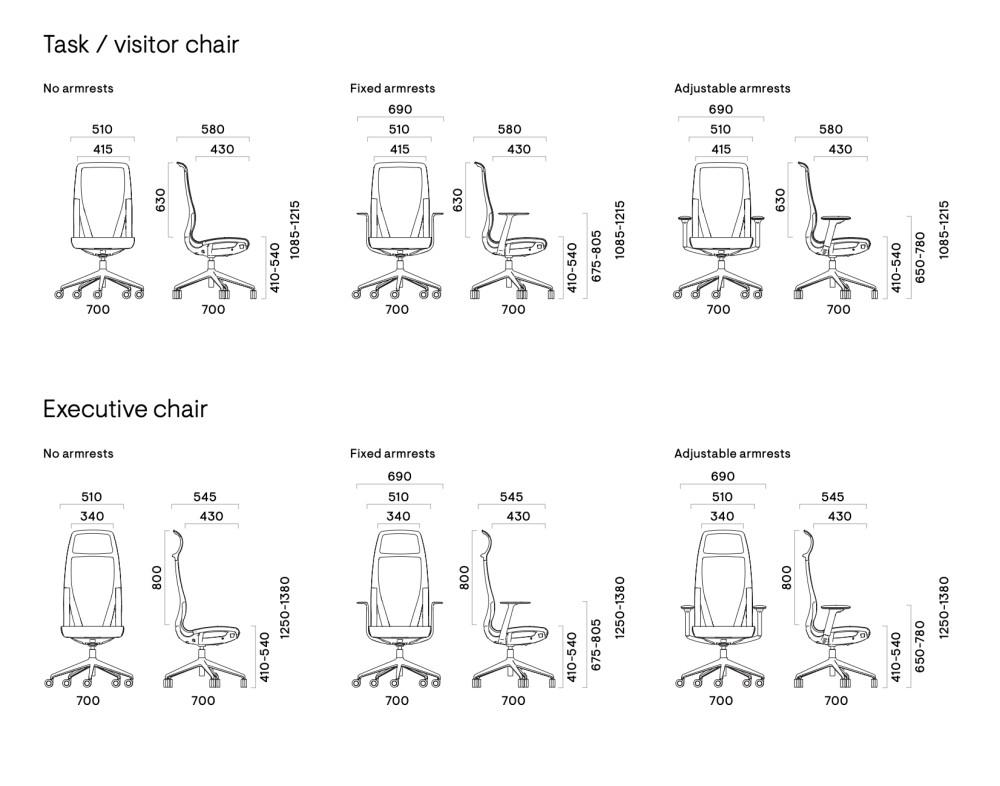 - malli: matala selkänoja (task chair) tai korkea selkänoja, jossa integroitu niskatuki (executive chair)