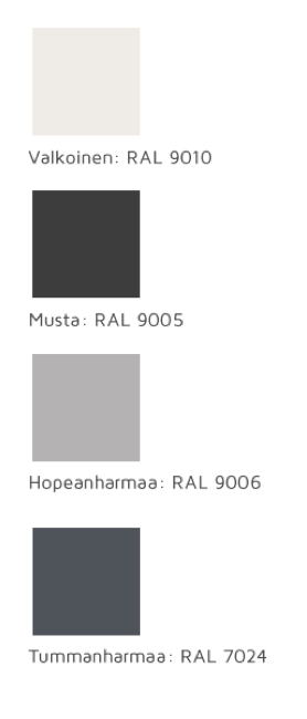 Värivaihtoehdot: musta, valkoinen, hopeanharmaa, tummanharmaa. Tilauksesta saatavilla myös muita värejä, kysy lisää!