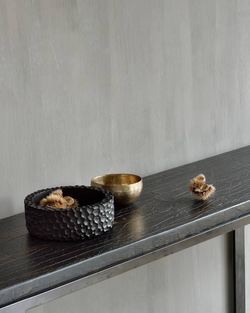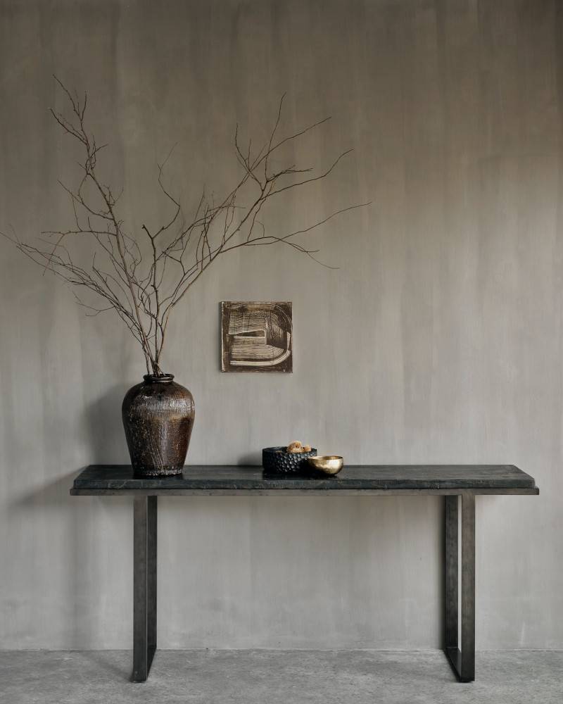 Ethnicraft Stability on konsolipöytä, jossa yhdistyvät mineraalipinnan käsityömäinen viimeistely ja selkeä metallirakenne. Paksu kansi muodostaa kontrastin kevyelle rungolle, ja pinnan sävy syntyy luonnon mineraalijauheiden ja pigmenttien yhdistelmästä. Jokainen kappale on viimeistelyltään yksilöllinen. Pöytä toimii tasokalusteena, jossa painottuvat esillepano ja kevyt säilytys. Avoin rakenne mahdollistaa helpon sijoitettavuuden osaksi erilaisia kalustekokonaisuuksia.