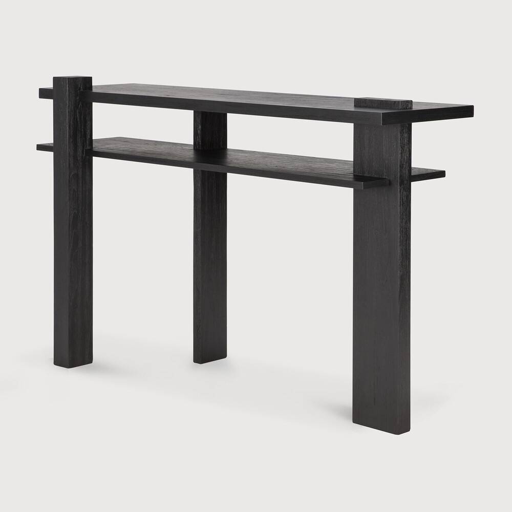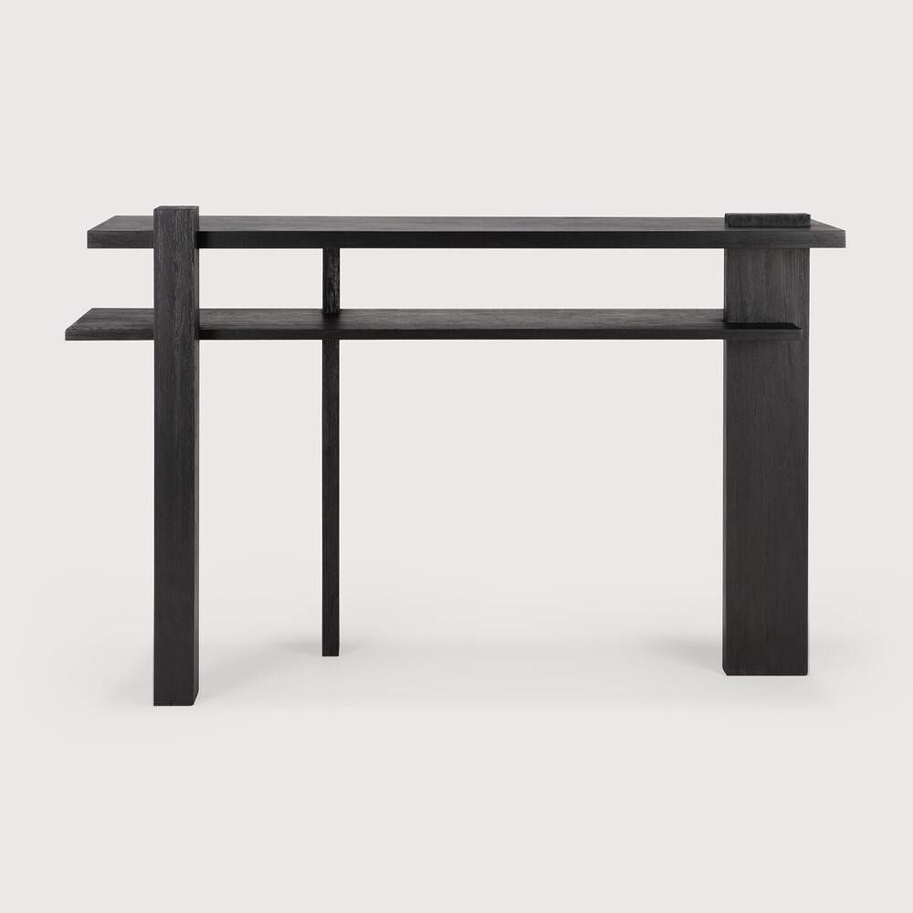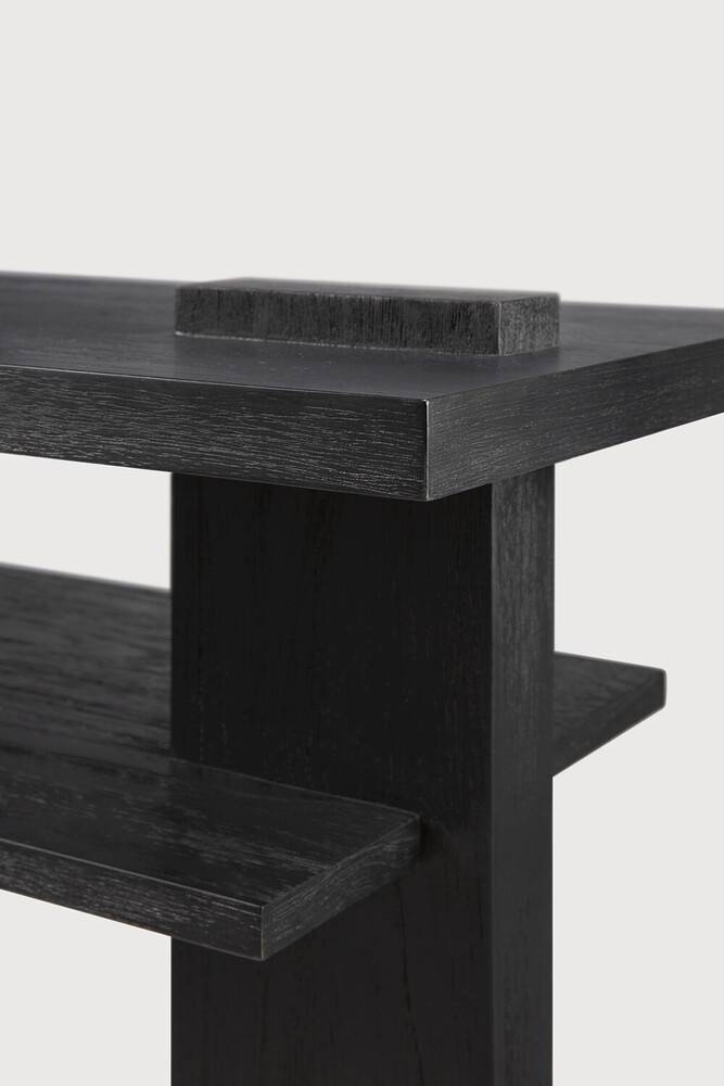 Ethnicraft Abstract on massiivitiikistä valmistettu konsolipöytä, jossa korostuvat selkeät linjat ja geometrinen rakenne. Mustaksi sävytetty pinta tuo kalusteeseen kontrastia ja korostaa rakenteen eri tasoja. Kokonaisuus on pelkistetty mutta ilmeeltään erottuva. Pöytä toimii tasokalusteena, jossa yhdistyvät esillepano ja kevyt säilytys. Rakenteessa oleva hyllytaso lisää käyttömahdollisuuksia.