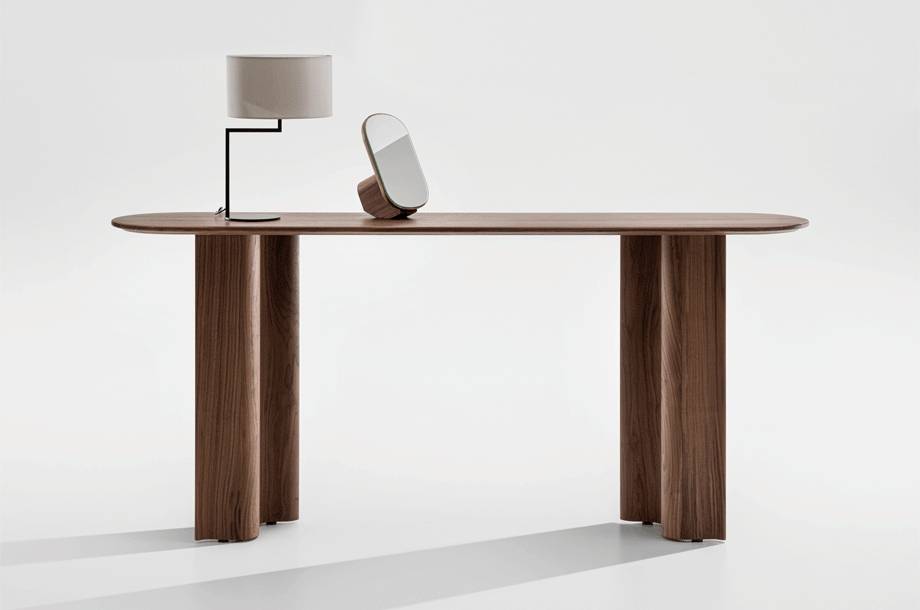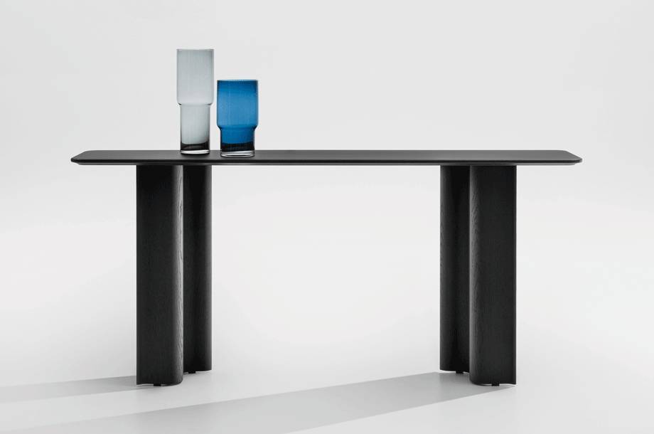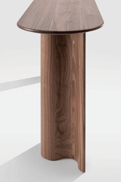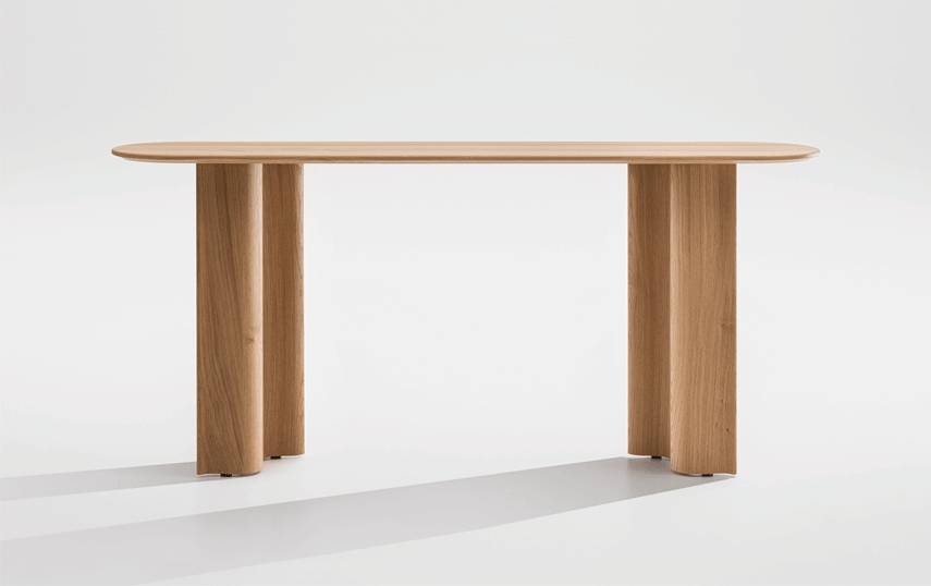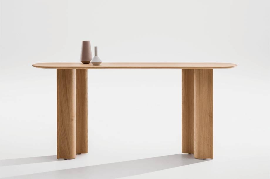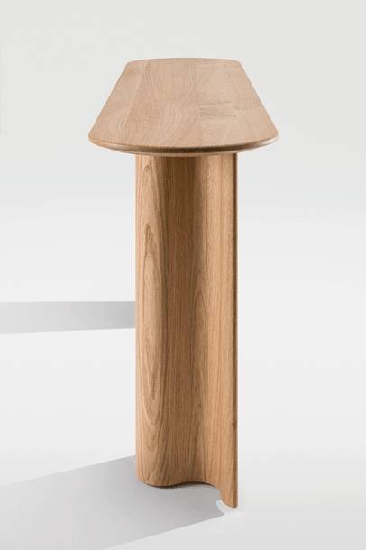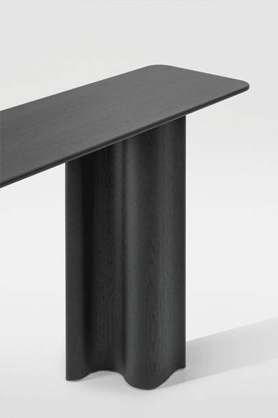 CURTAIN CONSOLE on massiivipuinen konsolipöytä, joka on suunniteltu auloihin, käytäville ja edustustiloihin. Se täydentää CURTAIN-tuoteperhettä kevyemmällä ja kapeammalla mittakaavalla, säilyttäen sarjalle tunnusomaisen veistoksellisen ilmeen. Pöytä toimii sekä käytännöllisenä laskutasona että tilaa jäsentävänä elementtinä.