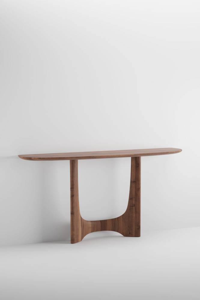 Konsolipöydän rakenne hyödyntää seinäpintaa osana kokonaisuutta, jolloin tukirakenne muodostaa H-muotoisen elementin. Tämä tekee rakenteesta vakaan ja samalla visuaalisesti kevyen.