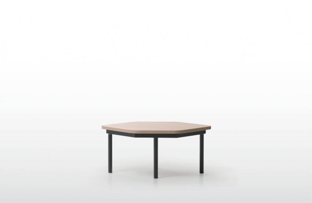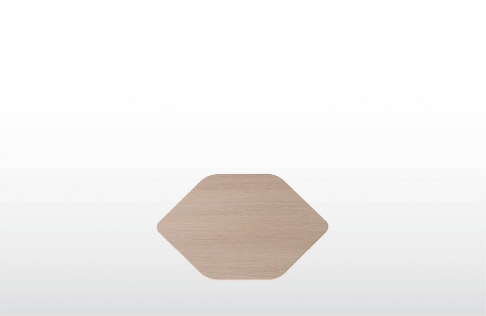 - Kuusikulmion mallinen pöytä mustilla jaloilla (mitat 57x70 cm, korkeus 44 cm)