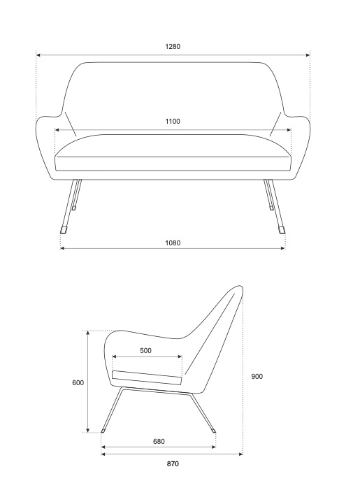 Sohvan mitat: lev. 128 syv. 87 ja kork. 90
